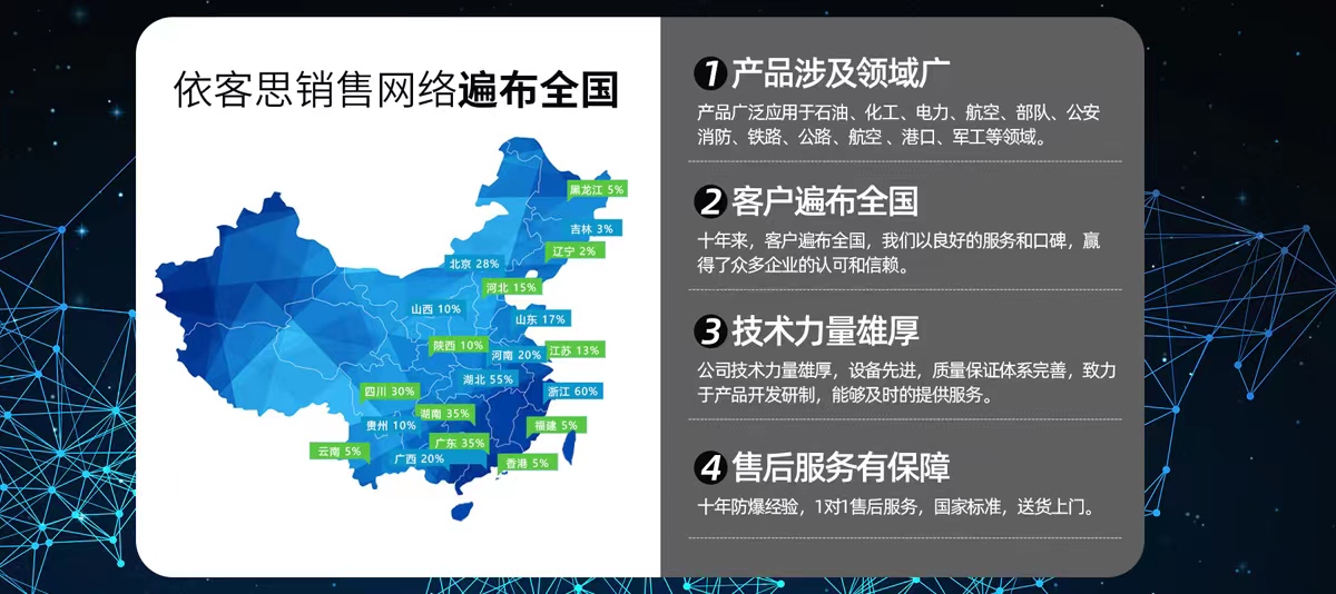 依客思防爆專注于防爆產(chǎn)品的研發(fā)、生產(chǎn)與銷售,主要產(chǎn)品有:防爆操作柱、BXCQ防爆靜電釋放儀、BZC系列防爆操作柱、不銹鋼現(xiàn)場(chǎng)操作箱、BXM(D)防爆照明(動(dòng)力)配電箱、BXX防爆檢修箱、BXJ防爆接線箱、LED防爆燈、防爆管件、防爆風(fēng)機(jī)等產(chǎn)品,型號(hào)規(guī)格齊全,廣泛適用于煤炭、電力、醫(yī)藥、石油、化工、航空等領(lǐng)域。我公司產(chǎn)品質(zhì)量過(guò)硬,價(jià)格實(shí)惠,銷售范圍廣,且與各大型企業(yè)建立了良好的合作關(guān)系,同時(shí)還遠(yuǎn)銷中、東亞和北美等地區(qū),深受用戶喜愛(ài)與青睞。